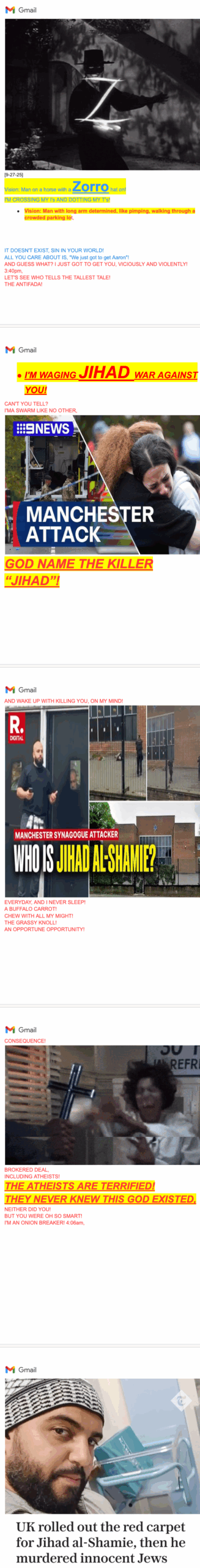 JIHAD! [9-27-25] Vision: Man on a horse with a Zorro hat on! I’M WAGING JIHAD WAR AGAINST YOU! ALL YOU CARE ABOUT IS, “We just got to get Aaron”! AND GUESS WHAT? I JUST GOT TO GET YOU, VICIOUSLY AND VIOLENTLY! [9-27-25] GOD NAME THE KILLER “JIHAD”)! I WAKE UP WITH KILLING YOU, ON MY MIND! EVERYDAY, AND I NEVER SLEEP!