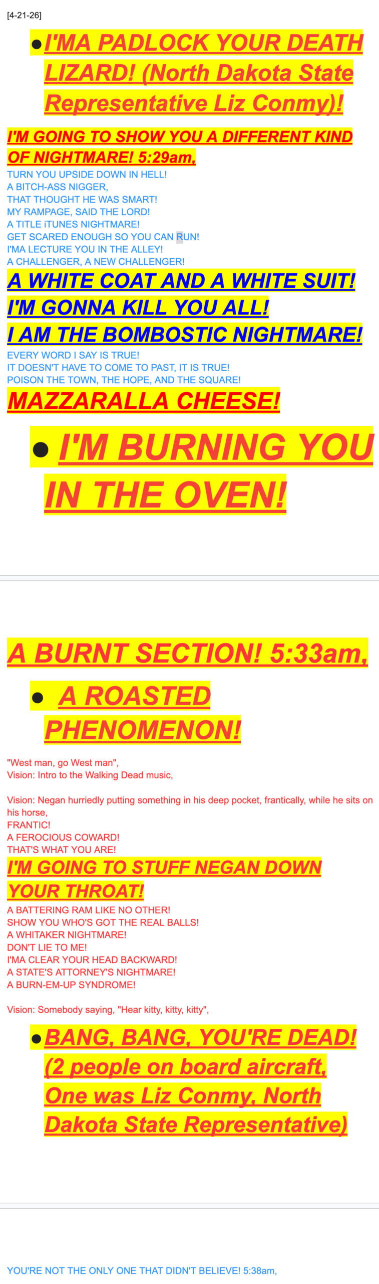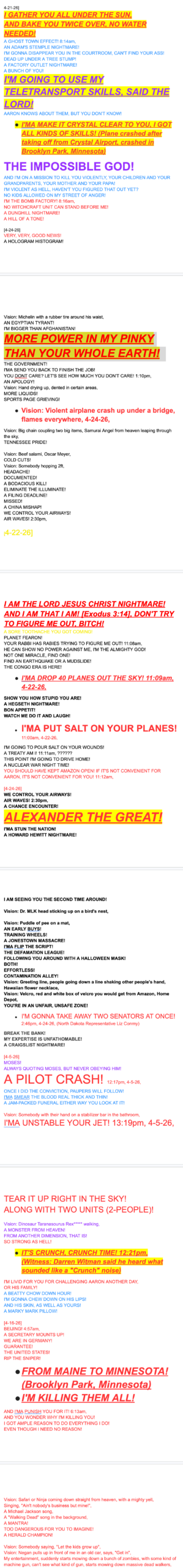 I’MA PADLOCK YOUR DEATH LIZARD! (North Dakota State Representative Liz Conmy) I’M BURNING YOU IN THE OVEN! A BURNT SECTION! 5:33am, A ROASTED PHENOMENON! BANG, BANG, YOU’RE DEAD! (2 people on board aircraft, One was Liz Conmy, North Dakota State Representative) A ROASTED PHENOMENON! I’MA UNSTABLE YOUR JET! 13:19pm, 4-5-26, TEAR IT UP RIGHT IN THE SKY! ALONG WITH TWO UNITS (2-PEOPLE)! IT’S CRUNCH, CRUNCH TIME! 12:21pm, (Witness: Darren Witman said he heard what sounded like a “Crunch” noise) I’M GATHER YOU ALL UNDER THE SUN, AND BAKE YOU TWICE OVER, NO WATER NEEDED! I’M GOING TO USE MY TELETRANSPORT SKILLS, SAID THE LORD! I’MA MAKE IT CRYSTAL CLEAR TO YOU, I GOT ALL KINDS OF SKILLS! (Plane crashed after taking off from Crystal Airport, crashed in Brooklyn Park, Minnesota) THE IMPOSSIBLE GOD! I AM THE LORD JESUS CHRIST NIGHTMARE! AND I AM THAT I AM! [Exodus 3:14], DON’T TRY TO FIGURE ME OUT, BITCH! FROM MAINE TO MINNESOTA! (Brooklyn Park, Minnesota) I’M KILLING THEM ALL!