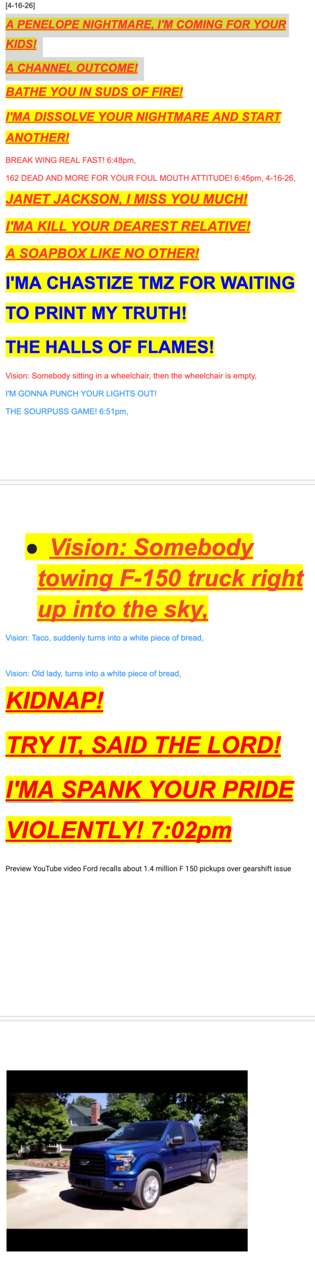 KIDNAP! TRY IT, SAID THE LORD! I’M SPANK YOUR PRIDE VIOLENTLY! 7:02pm Vision: Somebody towing F-150 truck right up into the sky,